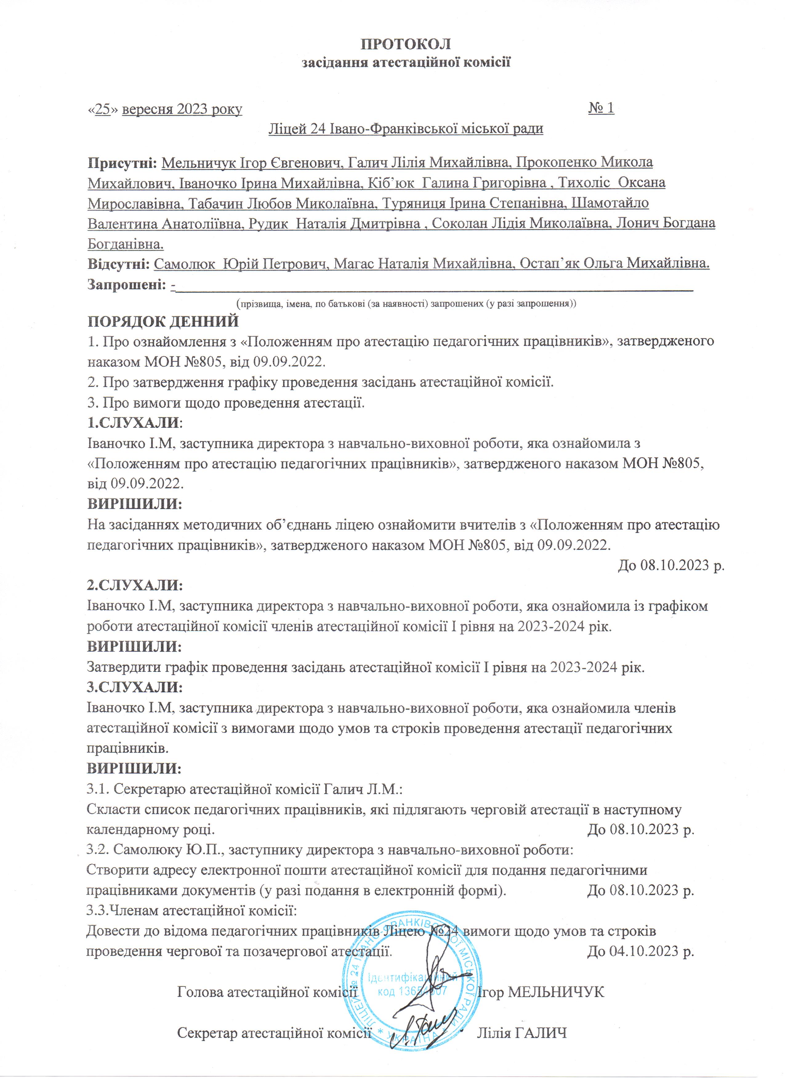 - СЛУХАЛИ: Мельничука Ігоря Євгенійовича, голову атестаційної комісії, який зауважив на необхідності оформити атестаційні листи у двох примірниках: перший примірник атестаційного листа упродовж трьох робочих днів з дати прийняття відповідного рішення атестаційної комісії видається педагогічному працівнику під підпис та/або надсилається у сканованому вигляді на його електронну адресу (з підтвердження отримання), другий - додається до його особової справи, а також видати наказ за результатами атестації не пізніше трьох робочих днів з дня отриманім документів.