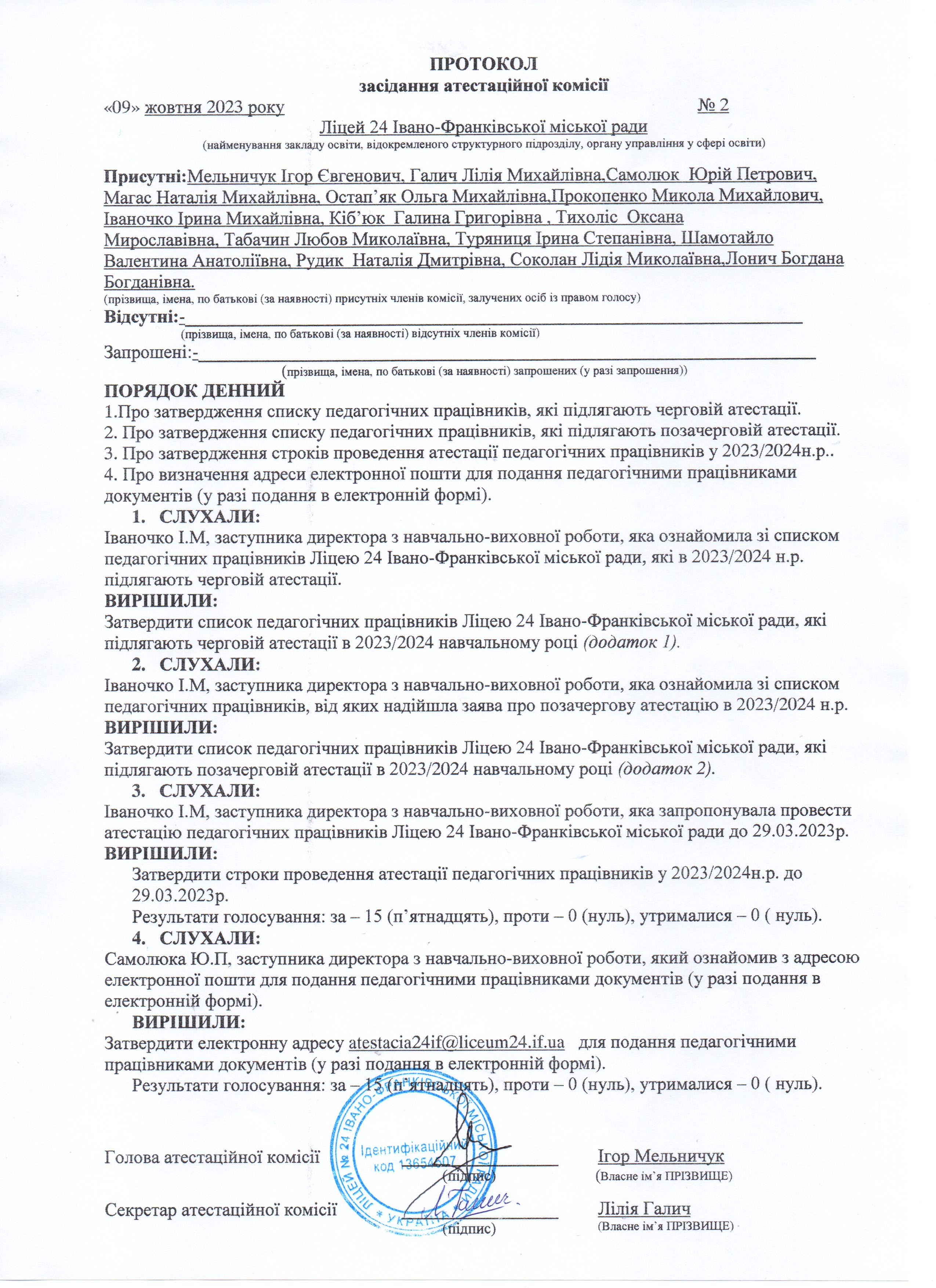 Мельничука Ігоря Євгенійовича, голову атестаційної комісії, який наголосив, що порядок голосування (відкрито чи таємно) визначається на засіданні атестаційної комісії та фіксується в протоколі. Особи, які входять до складу атестаційної комісії, не беруть участі в голосуванні щодо себе у разі проходження ними атестації (Іваночко І.М., Самолюк Ю.П., Галич Л.М. , Рудик Н.Д., Магас Н.М., Тихоліс О.М.). Рішення атестаційної комісії приймають шляхом голосування простою більшістю голосів. У разі рівного розподілу голосів «за» і «проти» атестаційна комісія приймає рішення в інтересах педагогічного працівника, який атестується. Голова запропонував голосувати відкрито.